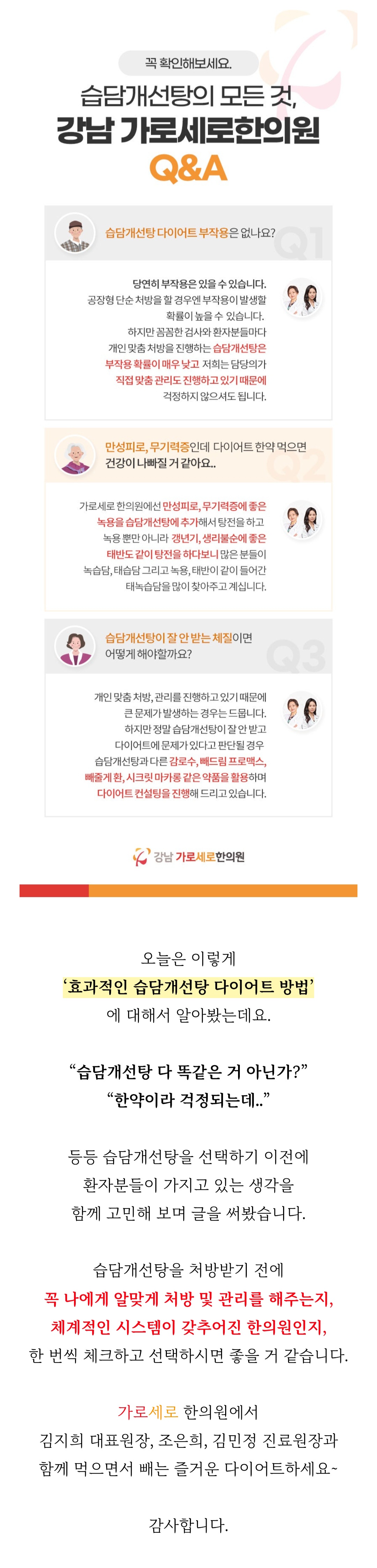 한의원다이어트 원조 강남 가로세로한의원에서는 이러한 체질적 원인을 근본적으로 다스리기 위해 오랜 임상 경험과 체계적인 연구를 통해 **‘습담개선탕’**을 개발했습니다.