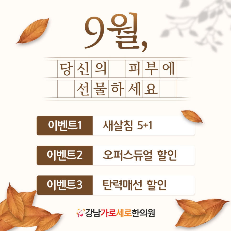 당신의 피부를 위한 특별한 기회, 9월 이벤트 소식! 가을 바람에 실락하는 잎들처럼, 9월이 찾아왔습니다. 더 우아하고 빛나는 당신의 피부를 위해,